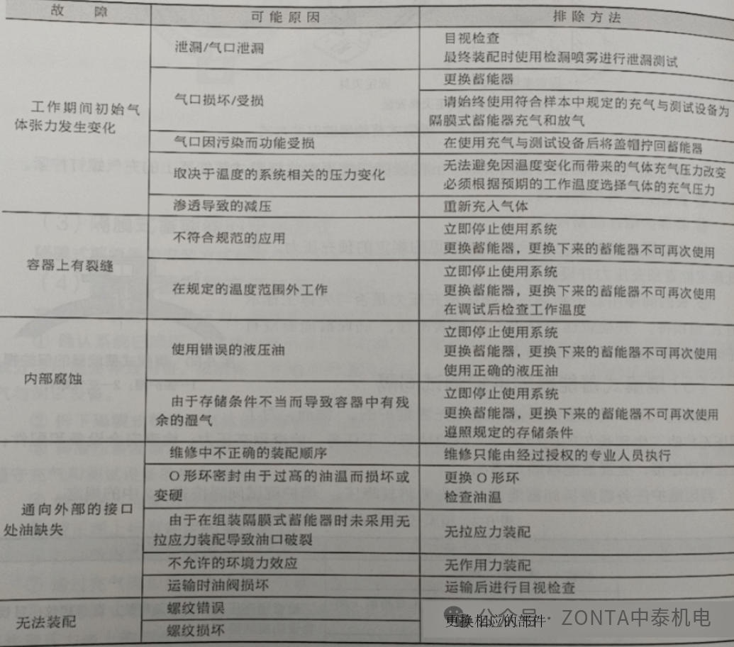 隔膜式蓄能器的常見(jiàn)故障與分析見(jiàn)下表: