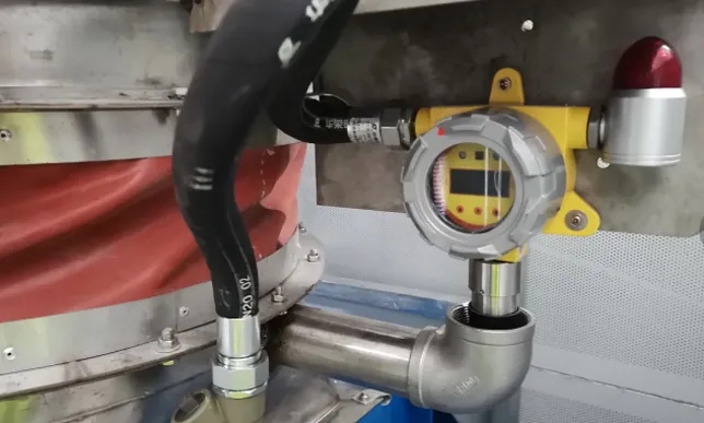 除塵系統(tǒng)排氣筒裝有可燃氣體報警器,數(shù)值通過PLC采集到現(xiàn)場主控柜,同時除塵器外部及投料口側吸罩頂部分別裝有可燃氣體濃度報警器,數(shù)值均傳送到中控室。