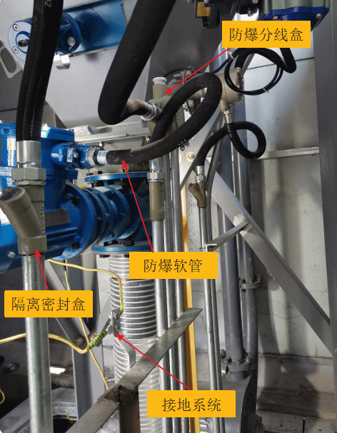 為了消除著火源,團隊對整個系統(tǒng)做了接地和電氣防爆等處理。例如,對MIB主設備殼體、氣包、卸灰和管鏈系統(tǒng)等進行可靠接地;對不銹鋼風管法蘭連接處及除塵軟管增加靜電跨接線。同時,系統(tǒng)不使用任何銅制配件,安裝專用接地網(wǎng)。此外,除塵主控制系統(tǒng)采用正壓防爆柜體,上電前充入隔離氣體,并保證100~200Pa 左右的正壓力;現(xiàn)場布線采用防爆軟管、防爆分線盒和隔離密封盒等措施,特殊地方用密封膠泥封堵等。