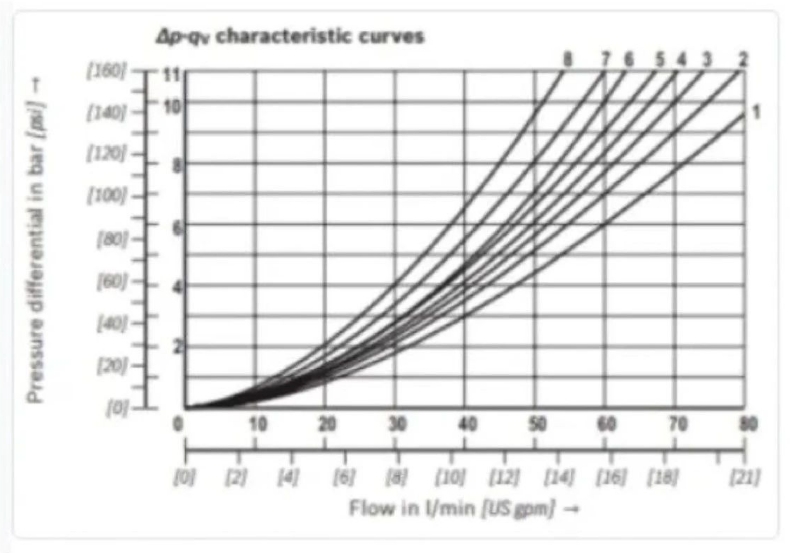 所有閥門都有不同的流動通道和流體方向變化,這將在特定流量下產(chǎn)生一定的壓降。這些壓降因不同的閥芯類型而異,這對于控制能源效率并確保負(fù)載有足夠的可用壓力非常重要。