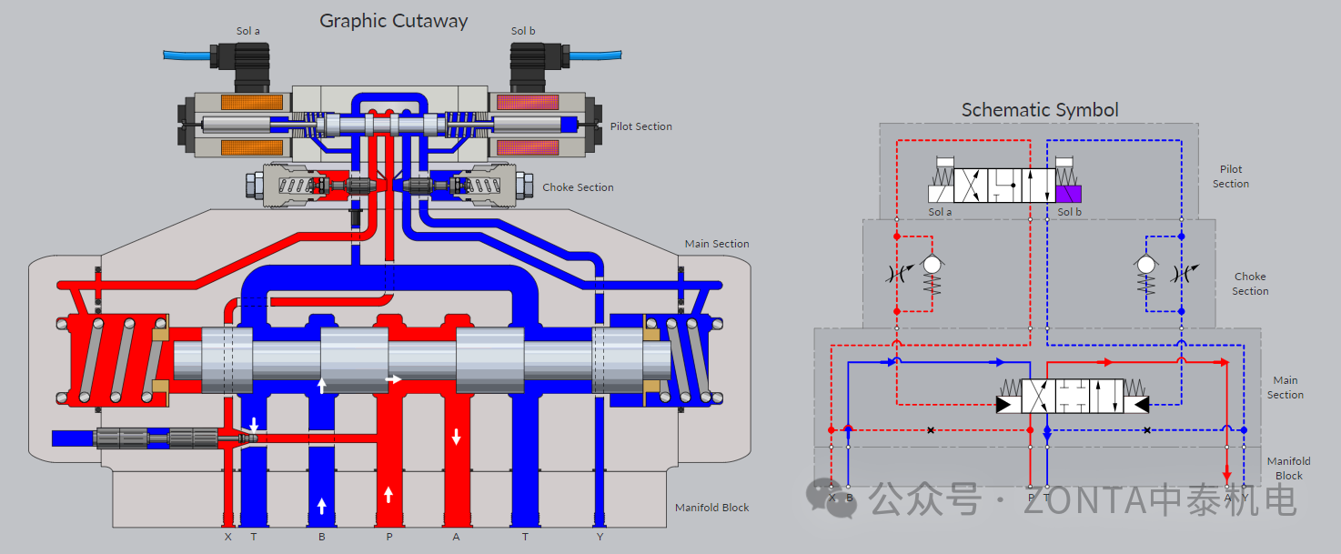 E型中位機(jī)能換向閥電磁鐵得電時(shí)的閥芯動(dòng)作