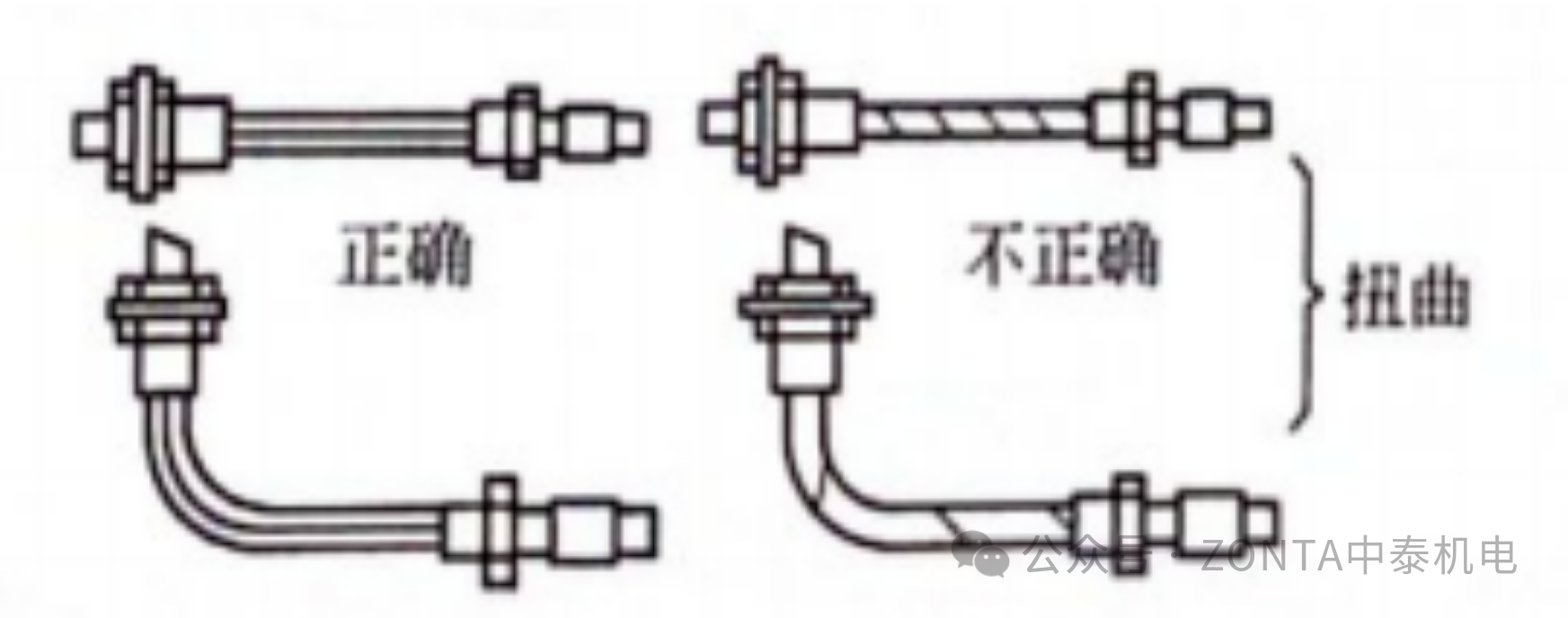 6、在直角拐彎處最好不用軟管,否則在壓力交變的工況下,會(huì)因軟管彎曲處的長(zhǎng)度和曲率半徑的變化而疲勞導(dǎo)致破裂,產(chǎn)生漏油,使用不銹鋼軟管時(shí)更應(yīng)注意。
