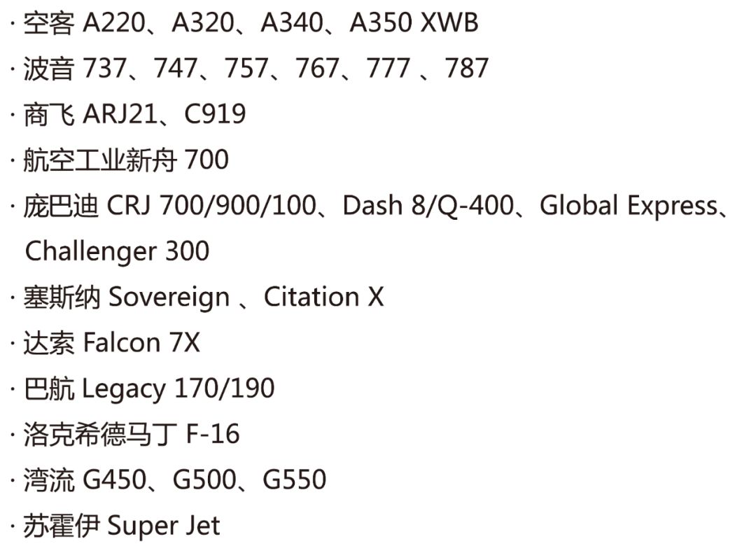 派克宇航生產(chǎn)的液壓部件被眾多飛機制造商廣泛采用,覆蓋不同飛機系列。如下機型更是采用了派克宇航的全套液壓系統(tǒng):波音787夢想飛機,空客350XWB飛機,商飛ARJ21支線飛機和C919大飛機,航空工業(yè)新舟700飛機,空客A220/230 (之前的龐巴迪C系列),蘇霍伊Super客機、巴航170/190/195,龐巴迪Dash8/Q400/CRJ900等民用運輸機,巴航Legacy 450/500、達索獵鷹7X、龐巴迪Global 5000/7000/8000等公務機。